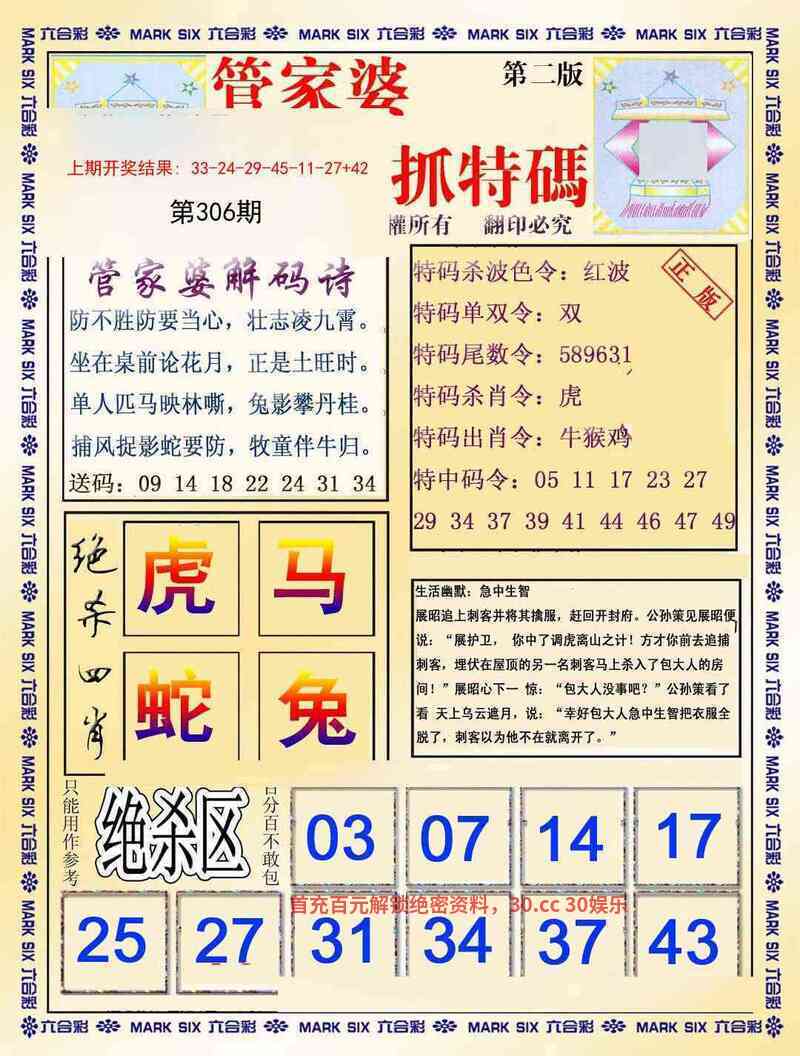 309期:特码暗语/曾道人救世心经/攻特料/六合心经/平码生肖点将